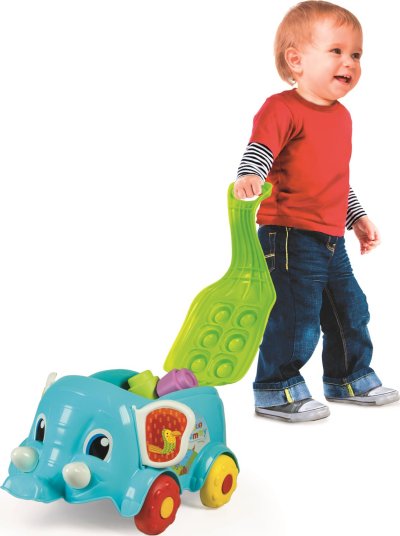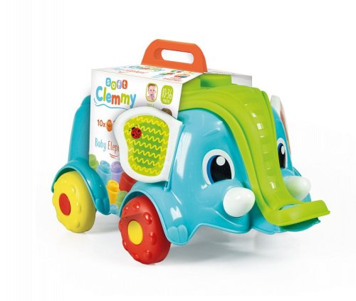 Malý vozík ve tvaru slůněte lze táhnout za sebou nebo tlačit. Uvnitř má měkké kostky Soft Clemmy, které jsou vhodné i do vany nebo pro mytí v myčce.
