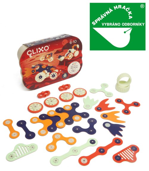 CLIXO Mars Rovers - 30 kusů je flexibilní, velmi lehká, ve tmě svítící magnetická stavebnice ze syntetického papíru ve 4 barevných kombinací, která je inspirována origami a zároveň je to skvělá Montessori hračka. Tato stavebnice je založena na principu spojování různých tvarů a dílků pomocí magnetů k sobě. Tematická vesmírná sada Mars Rovers, umožňuje sestavovat díky přiloženým 2 druhům svítících kol vozítka, motocykly a vesmírné drony pro prozkoumávání marťanské krajiny. Inspirace pro různé stavby naleznete na papírovém balení, jež tvoří obal výrobku. V tomto zázračném balení se skrývá svět zábavných objevů!Charakteristika sady: • Počet tvarů: 12• Počet kusů: 30 (ve 4 barvách a z toho 1 fosforeskující)• Rozměr balení: 16,5 x 16,5 x 6,5 cm• Váha balení: 150 gramů• Rozměry prvků: cca 10 x 10 cm• Doporučený věk: 6-99Hlavní vlastnosti stavebnice CLIXO:• Vysoce kvalitní, ekologické dílky pro dlouhé hodiny hraní• Vysoká flexibilita prvků• Voděodolné díly díky použití kvalitního syntetického papíru, které umožňují hraní i ve vodě• Velmi silné magnety (prvky přitahující se z velké vzdálenosti i několika cm)• Lehké a kompaktní, ideální pro tvoření doma i na cestách• Nespočet výtvorů z hrstky dílků, jednoduše poskládejte a sbalte• Bezplatný přístup na YouTube k dalším stavbám, tipům a trikům• Brožura s kreativními návrhy pro vytváření různých konstrukcí v každé sadě• Přizpůsobitelný hrací systém podporuje kreativní myšlení a sebevyjádření• Umožňuje zábavu, soustředění a úlevu od stres