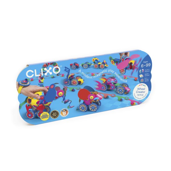 CLIXO Wheel Creator - 72 kusů je flexibilní, velmi lehká, magnetická stavebnice ze syntetického papíru v 6 barevných, hravých kombinacích, která je inspirována origami a zároveň je to skvělá Montessori hračka. Tato stavebnice je založena na principu spojování různých tvarů a dílků přichycením červených a modrých magnetů k sobě. Sada Wheel Creator umožňuje díky dřevěným kolům, která jsou součástí balení, stavět širokou škálu výtvorů, které se mohou pohybovat nebo otáčet a to vše v barvách duhy. Kola dokáží tuto stavebnici doslova rozpohybovat a jezdící auta, vlaky, ale i pohybující se zvířátka jsou pro děti velkým lákadlem. Díky dlouhým páskovým dílkům je možné vytvořit třeba kočár nebo jiné výtvory následně zavěsit. Inspirace pro různé stavby naleznete na papírovém balení, jež tvoří obal výrobku. V tomto zázračném balení se skrývá svět zábavných objevů!