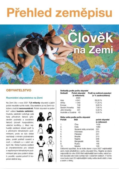 Víte, jaká jsou nejbezpečnější města světa, které památky jsou nejnavštěvovanější nebo ve kterých státech žijí nejšťastnější lidé? Tento přehled zeměpisu nabízí ucelené a stručné informace o lidech na naší planetě. Víte, že na Zemi žilo v roce 2021 neuvěřitelných 7,8 miliardy obyvatel a jejich počet neustále roste? Z přehledu se dozvíte, jaká je hustota zalidnění v jednotlivých světadílech, základní rozdělení podle rasy nebo náboženského vyznání. Zjistíte, jaké jazyky jsou nejrozšířenější, a najdete zde i ukázku některých písem. Přehled obsahuje také informace o urbanizaci, migraci nebo nárůstu počtu obyvatel a jejich věkovém složení. Nechybí ani politické uspořádání a světové hospodářství nebo výčet mezinárodních organizací. Vše je doplněno o barevné mapy, grafy a tabulky s pořadím "deseti nej". Přehled obsahuje také kompletní seznam všech 194 nezávislých států, včetně států s omezeným uznáním a závislých území. Přehled je skladný, takže ho snadno přibalíte do školní tašky, kde nezabere téměř žádné místo. Ocení ho především žáci 2. stupně základních škol a víceletých gymnázií, ale také ti, kdo mají rádi zeměpis a rádi si zopakují to, co už možná dávno zapomněli, či se z něj dozvědí něco zaručeně nového.