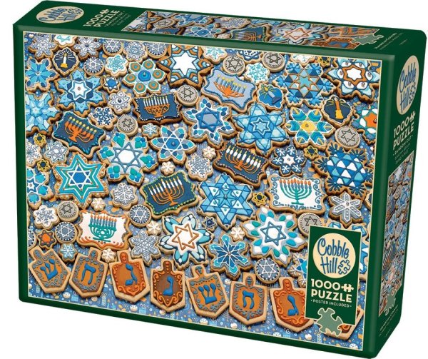 Chanuka je Svátek světel, který se slaví na paměť zázraku, který se stal, když Židé po příchodu do Chrámu, znesvěceného vojsky, našli pouze jednu nádobu s čistým olejem pro chrámovou menoru-svícen. Olej by stačil snad na jeden den, avšak hořel celých osm dní než byl vylisován a připraven olej nový. Na sušenkách jsou znázorněné chanukové svícny, dreidely i Davidovy hvězdy. Raznice puzzle COBBLE HILL nekopíruje standardní mřížku, rohy a hrany dílků nejsou vždy v jedné ose a dílky mají neobvyklý tvar. Obtížnost puzzle je tak vyšší než u klasické mřížkové raznice, kterou používají přední výrobci v Evropě. V balení je předloha o velikosti 31,6 x 22,9 cm. Rozměr složeného puzzle cca 67,6 x 48,9 cm