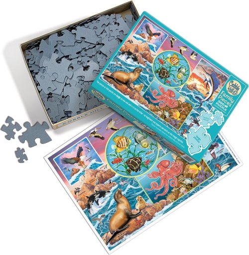 Skládá celá rodina! Jedinečnost rodinného puzzle od výrobce Cobble Hill spočívá v tom, že balení obsahuje dílky ve třech odlišných velikostech. Dílky mají malou, střední a velkou velikost a skládání je tak pohodlné pro děti, rodiče i prarodiče. V jedné části obrázku jsou velké dílky, které jsou díky svým rozměrům vhodné pro menší děti. Na druhé straně skládaného motivu jsou malé dílky, vhodné pro dospělé a větší děti, které jsou již zvyklé skládat puzzle. Prostřední část puzzle obsahuje dílky střední velikosti, na těchto dílcích jde zřetelně vidět skládaný motiv a sestavování obrázku je tak vhodné pro starší děti, babičku i dědečka. Velikosti dílků: velké cca 6 cm střední cca 3,5 cm malé cca 2 cm Raznice puzzle COBBLE HILL nekopíruje standardní mřížku, rohy a hrany dílků nejsou vždy v jedné ose a dílky mají neobvyklý tvar. Obtížnost puzzle je tak vyšší než u klasické mřížkové raznice, kterou používají přední výrobci v Evropě. Rozměr složeného puzzle cca 67,6 x 48,9 cm