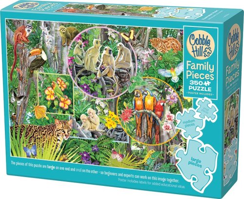 Skládá celá rodina! Jedinečnost rodinného puzzle od výrobce Cobble Hill spočívá v tom, že balení obsahuje dílky ve třech odlišných velikostech. Dílky mají malou, střední a velkou velikost a skládání je tak pohodlné pro děti, rodiče i prarodiče. V jedné části obrázku jsou velké dílky, které jsou díky svým rozměrům vhodné pro menší děti. Na druhé straně skládaného motivu jsou malé dílky, vhodné pro dospělé a větší děti, které jsou již zvyklé skládat puzzle. Prostřední část puzzle obsahuje dílky střední velikosti, na těchto dílcích jde zřetelně vidět skládaný motiv a sestavování obrázku je tak vhodné pro starší děti, babičku i dědečka. Velikosti dílků: velké cca 6 cm střední cca 3,5 cm malé cca 2 cm Raznice puzzle COBBLE HILL nekopíruje standardní mřížku, rohy a hrany dílků nejsou vždy v jedné ose a dílky mají neobvyklý tvar. Obtížnost puzzle je tak vyšší než u klasické mřížkové raznice, kterou používají přední výrobci v Evropě. Rozměr složeného puzzle cca 67,6 x 48,9 cm