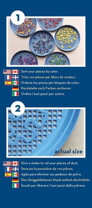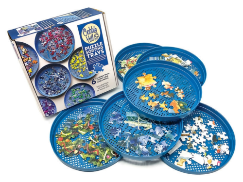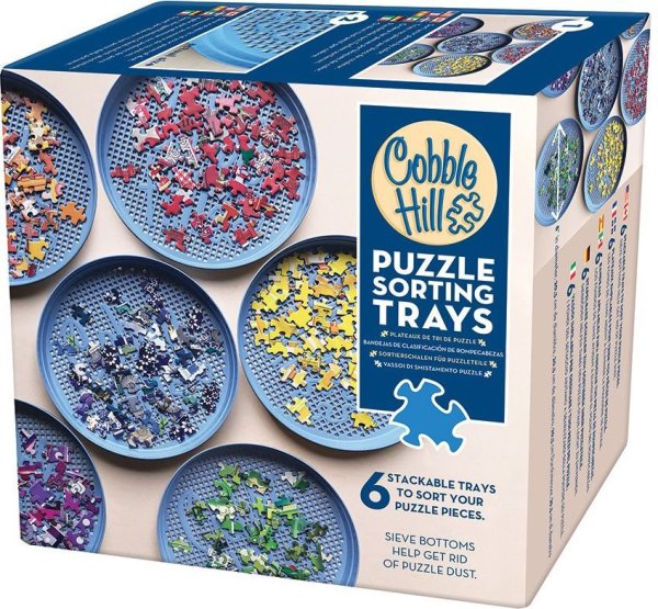 Prosít! Třídit! Ukládat! Příslušenství pro všechny příznivce puzzle! Třídič na puzzle - to je šest praktických nádob ve tvaru tácku: - přehledné třídění puzzle dle tvaru nebo barev - po skládání lze přihrádky jednoduše naskládat na sebe (stohovat) - třídič i s dílky lze uschovat zpět do krabice, zabírají méně místa a dílky se neztratí Balení obsahuje 6 ks, průměr 20,3 cm. Třídič na puzzle COBBLE HILL má kapacitu 1000 dílků, lze jej využít i při skládání větších puzzle (pro roztřídění části dílků) .