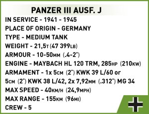 Postavte si model německého středního tanku z 2. světové války Panzerkampfwagen III. Byl to nejdynamičtěji vyvíjený model sloužící v armádě Třetí říše. V letech 1937 až 1943 vzniklo mnoho jeho verzí. Úspěšný podvozek posloužil jako základ pro výrobu dalších vojenských vozidel. Byla to velmi dobrá konstrukce, používaná až do samého konce války. Posádku tvořilo 5 vojáků. Balení obsahuje 590 kostek stavebnice a 1 figurku vojáka.