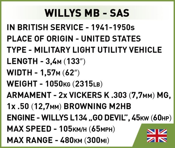 Postavte si model Willys . Licencovaný Willys Jeep byl vydán v barvách britských jednotek SAS. Světově nejoblíbenější terénní vozidlo z druhé světové války.Prezentovaný model se výrazně liší od těch ve výzbroji americké armády. Co opravdu upoutá, je velmi charakteristická vykrojená mřížka vozu s kondenzátorem vedle. Tato úprava továrního vozu umožňuje provoz v těžkých pouštních podmínkách, kde se velmi snadno přehřeje! Balení obsahuje 180 kostek a 3 figurky.