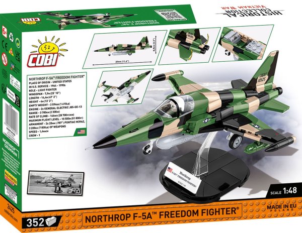 Postavte si model Northrop F-5A Freedom Fighter, lehký nadzvukový stíhací letoun, který byl vyvinut v 60. letech 20. století společností Northrop Corporation. Letoun F-5A byl určen zejména k útokům na pozemní a v menší míře i na vzdušné cíle. Do provozu byl uveden v roce 1964. Jeho hlavními vlastnostmi jsou dobrá ovladatelnost, jednoduchost ovládání a relativně nízká provozní cena. Tento letoun byl používán mj. během konfliktu ve Vietnamu, na což odkazuje historické značení našeho modelu. Balení obsahuje 352 kostek stavebnice a model je v měřítku 1:48
