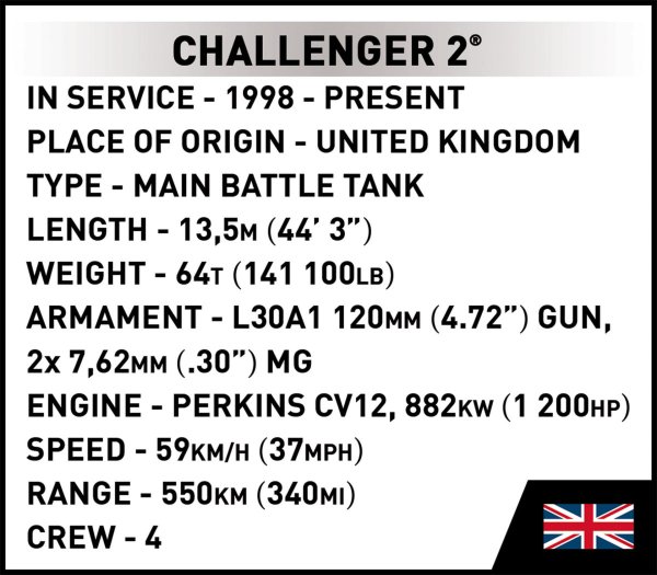 Postavte si model moderní, současný tank Challenger 2 Tento model vstoupil do britské služby v roce 1998 a neustále se vyvíjí. Tanky tohoto typu se používají také v Ománu a na Ukrajině. Sada obsahuje dvě sady označení, ze kterých si můžete vybrat. Tento tank si můžete postavit v ukrajinské nebo britské verzi.Challenger 2 je známý svou vynikající pancéřovou ochranou, díky které je pro nepřítele obtížným cílem. Od vstupu do služby v roce 1998 se tank účastnil bojových operací, včetně bojových operací v Iráku a na Balkáně, a získal si reputaci pro svou spolehlivost a efektivitu na bojišti. Tanky Challenger 2 darované Brity se v současné době účastní bojů na Ukrajině. Balení obsahuje 954 kostek a 1 figurku.