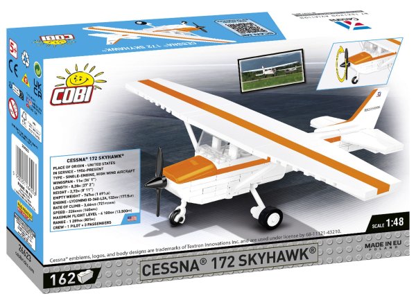 Postavte si model Cessna 172 Skyhawk jednomotorový, čtyřmístný turistický a cvičný letoun vyráběný společností Cessna Aircraft Company. Byl představen v roce 1956 a je jedním z nejpopulárnějších letadel v historii letectví. Skyhawk je široce používán pro výcvik pilotů, turistické lety a pozorovací úkoly. Cessna je hornoplošník s kovovou konstrukcí a výbornými letovými vlastnostmi. Letadlo se snadno ovládá a udržuje. Cessna 172 se dodnes vyrábí v mnoha verzích a široce používána po celém světě v civilním i vojenském sektoru. Balení obsahuje 162 kostek.