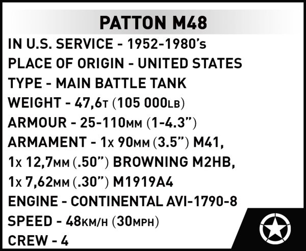 Postavte si model M48 Patton střední tank, který se stal ikonou amerického obrněnce během studené války. Tento tank pojmenovaný po generálu George Pattonovi se vyráběl v letech 1952 až 1961 a sloužil v mnoha armádách po celém světě. M48 Patton byl použit v korejské a vietnamské válce. V některých armádách zůstává ve službě dodnes, i když byl nahrazen modernějšími tanky. Balení obsahuje 127 kostek.