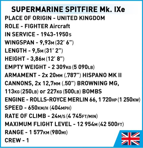 Postavte si model Supermarin Spitfire Mk. IX byl navržen jako reakce na výhodu Luftwaffe a strojů, jako jsou moderní Messerschmitty Bf 109G a Focke-Wulfy Fw 190A. Model COBI s nápisem "Mary Rose" na boku je inspirován autentickým strojem z druhé světové války. Spitfire Mk.IX s sériovým číslem EN199, který se v současné době nachází v Maltském leteckém muzeu, je namalován v pouštní kamufláži, která odkazuje na jeho bohoslužbu na 81 Squadron v severní Africe v roce 1943.