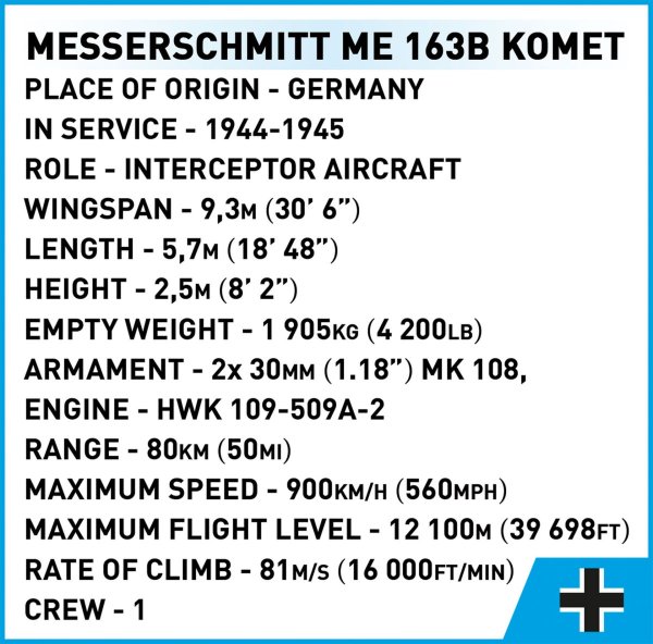 Messerschmitt Me 163B "Komet" - Postavte si nejrychlejší letoun 2. světové války s kostkami COBI! Objevte fascinující historii jednoho z nejunikátnějších bojových letadel 2. světové války! Messerschmitt Me 163B "Komet" je jediný plně funkční stíhač s raketovým pohonem, který se skutečně účastnil vojenských operací. Se sadou COBI si můžete postavit realistický model tohoto unikátního stroje v měřítku 1:32.
