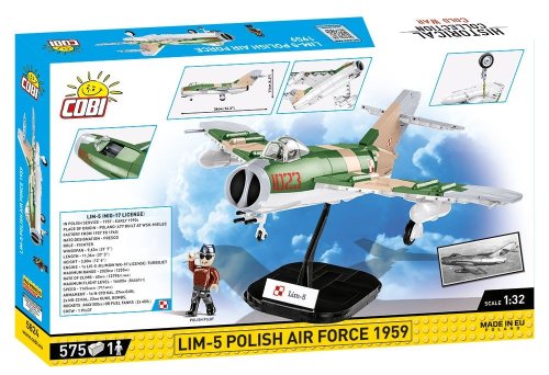 Postavte si model stíhacího letounu Lim-5 je sovětský licenční Mikoyan MiG-17F vyráběný polským leteckým průmyslem v Mielci, kde vyrábíme naše stavebnice. První letoun Lim-5 vstoupil do služby v roce 1957 a celkem bylo postaveno 477 letadel. Náš model má kamufláž a značení podle historického letounu, který je dnes technickou památkou. Balení obsahuje 575 kostek stavebnice a figurku pilota.