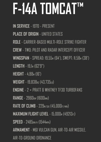 Postavte si model Grumman F-14 Tomcat je jedním z nejikoničtějších stíhacích letounů v historii moderního letectví. Symbolizuje technologickou přesnost a bezkonkurenční manévrovatelnost. Po desetiletí vzbuzuje obdiv jak mezi piloty, tak mezi vojenskými nadšenci. V Top Gun: Maverick, tento mocný bojovník patřil nepřátelským silám. Byl nalezen na letišti, pak ho převzali a unesli Maverick a Bradley "Rosother" Bradshaw. Tehdy F-14 ukázala své plné schopnosti v leteckém boji proti nepřátelským strojům! Balení obsahuje 869 kostek a 2 figurky.