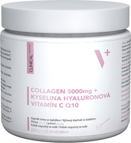 Collagen 5000 mg + kyselina Hyaluronová + vitamin C & Q10 je doplněk stravy, který poskytuje kvalitní péči o pokožku, vlasy a nehty a napomáhá udržovat dobrý stav kostí, kloubů a pojivových tkání.