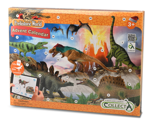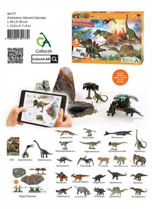 Adventní kalendář zpříjemní čekání na Štědrý den a čas do Vánoc uteče jako voda. Kalendář obsahuje: 24 figurek, 12 kartiček a diorama pravěké krajiny. Pomocí aplikace se figurky rozpohybují (QR kód na obalu). Jak na to: Stáhni si do svého mobilního telefonu nebo tabletu aplikaci CollectA AR. Otevři aplikaci a nasměruj telefon nebo tablet na kartičku zvířátka. Zvířátko se ti začne hýbat. Pomocí šipek ovládáš jeho pohyb. Bude chodit, kam budeš chtít. Můžeš si ho i pohladit. Pomoci tlačítka „otevřené tlamy“ ovládáš zvukové efekty. Tlačítko „i“ skrývá informace o zvířátku v anglickém jazyce. Zvířátko si můžeš i vyfotit. Fotky se uloží do galerie telefonu nebo tabletu.