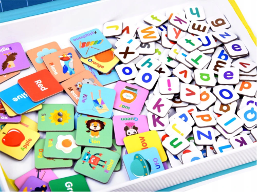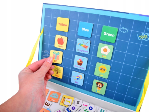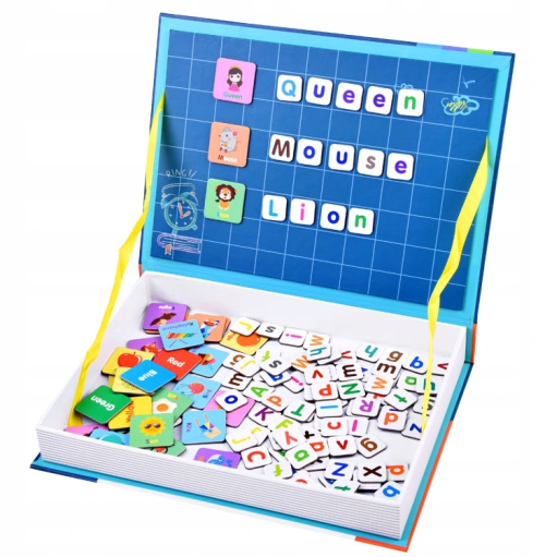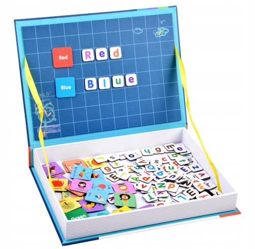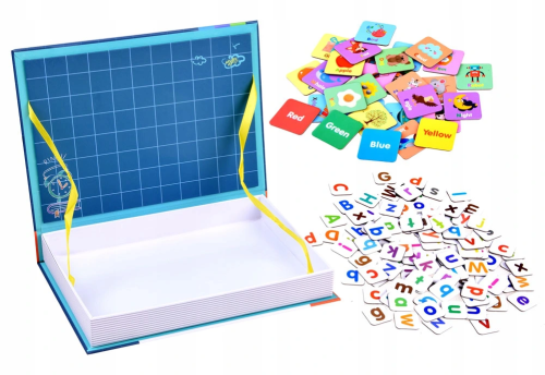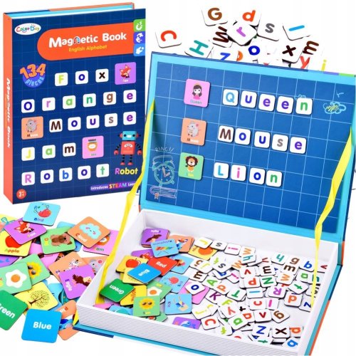 Magnetická kniha - tvořivá naučná hračka! Sada se skláda ze 134 prvků, včetně malých a velkých písmen, obrázků se jmény a názvy barev. Kreativní sada je v praktickém balení ve tvaru knihy, vše do ní vejde a dá se snadno přenášet či vzít na výlet nebo na dlouhé cesty. Magnetická kniha pro děti je krásná nadčasová hračka, která se bude líbit několika generacím a je vyrobená z kvalitních materiálů a zdravotně neškodných barev. Balení obsahuje: písmena abecedy ,malá i velká,, obrázky včetně anglického popisu.