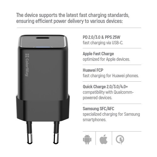 ColorWay GaN Mini představuje moderní kompaktní nabíječku využívající pokročilou GaN (Gallium Nitride) technologii, která zajišťuje menší rozměry, nižší hmotnost a vyšší účinnost oproti tradičním adaptérům. S maximálním výkonem 25 W a podporou nejnovějších rychlonabíjecích protokolů včetně PD 3.0 PPS, Apple Fast Charge a Quick Charge 4.0+ nabízí optimální řešení pro každodenní nabíjení i cestování.