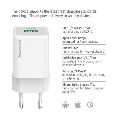 Síťová nabíječka ColorWay CW-CHS055PDC-WT představuje moderní řešení pro rychlé nabíjení vašich zařízení. Díky dvěma portům (USB-C a USB) umožňuje současné nabíjení dvou zařízení s celkovým výkonem až 35 W. Nabíječka podporuje pokročilé rychlonabíjecí technologie včetně PD 3.0 PPS, Quick Charge 3.0/4.0+ a mnoha dalších protokolů specifických pro jednotlivé výrobce.