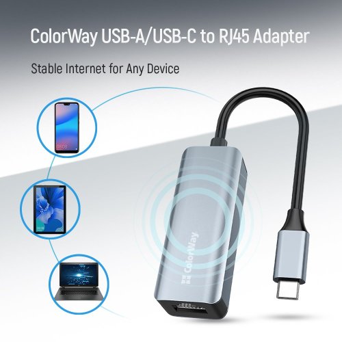 ColorWay síťový adaptér CW-AD-CRG představuje ideální řešení pro zařízení bez vestavěného LAN portu. Umožňuje snadné připojení notebooků, počítačů, smartphonů nebo tabletů s podporou OTG k drátové internetové síti rychlostí až 1 Gbps. Díky univerzálnímu designu s oběma typy USB konektorů je kompatibilní se širokou škálou zařízení.