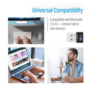 Adaptér vyniká zpětnou kompatibilitou s verzemi Bluetooth 2.0 až 5.2, takže funguje se zařízeními všech generací. Díky funkci Plug & Play pro Windows 8.1 a novější není potřeba instalovat žádné ovladače.