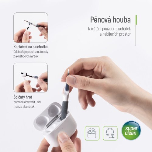 Čisticí sada navržená pro bezpečné a důkladné čištění elektronických zařízení bez rizika poškození povrchů. Obsahuje specializované nástroje, které umožňují efektivně odstranit prach, nečistoty, otisky prstů a další usazeniny z klávesnic, sluchátek, displejů a dalších citlivých částí elektroniky. Díky široké škále nástrojů lze dosáhnout i do těžko přístupných míst, jako jsou mezery mezi klávesami, mřížky reproduktorů nebo vnitřní části sluchátek. Mikrovláknová utěrka a měkký kartáček zajišťují šetrné čištění bez škrábanců či jiného poškození. Kompaktní design s integrovaným držákem na telefon činí tuto sadu ideálním společníkem pro domácí i cestovní použití.