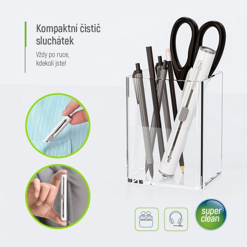 Univerzální čisticí nástroj navržený pro důkladnou údržbu sluchátek. Díky třem různým nástavcům efektivně odstraňuje nečistoty, prach a ušní maz z obtížně přístupných míst, aniž by poškodil povrch či jemné komponenty. Kompaktní a lehký design umožňuje snadné přenášení a použití kdekoli – doma, v kanceláři nebo na cestách. Každá část čisticího pera má svou specifickou funkci. Pěnová houba se dostane do hlubších částí pouzdra sluchátek a odstraní usazený prach. Jemný kartáček efektivně vyčistí mřížky reproduktorů a další citlivé části, zatímco špičatý hrot pomůže odstranit ušní maz. Díky intuitivnímu posuvnému mechanismu lze snadno přepínat mezi jednotlivými nástavci podle aktuální potřeby.