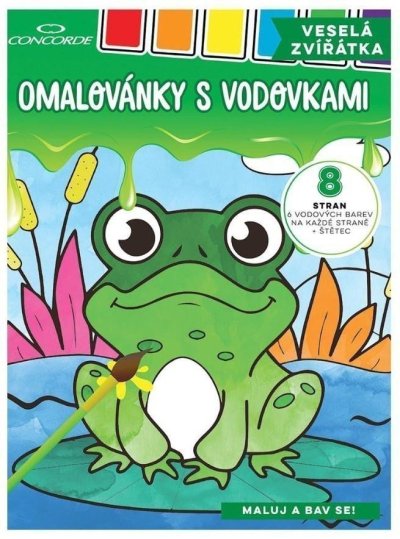 Omalovánky s vodovkami obsahují 8 veselých obrázků s motivem veselých zvířatek. Každý obrázek má v dolní části 6 vodových barev (červenou, oranžovou, žlutou, modrou, zelenou a fialovou). Balení obsahuje také malířský štětec. Omalovánky mají formát A4.