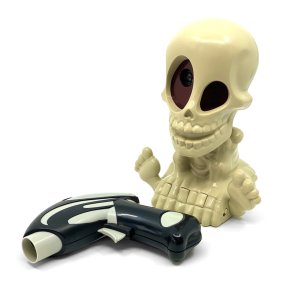 Kostlivec je z plastu a je navržen tak, aby působil zábavně a zároveň lehce strašidelně, což podporuje atmosféru hry. Jeho tělo je propracované s viditelnými žebry a kostmi, sedí s roztaženýma nohama a vztyčenýma rukama, které slouží jako součást herního mechanismu. Oči ducha jsou průhledné a slouží pravděpodobně k detekci zásahů ze zbraní. Zbraně ve tvaru pistole mají ergonomicky tvarovanou rukojeť a spoušť, což usnadňuje jejich držení a používání během hry.