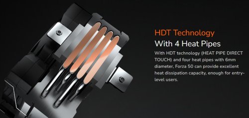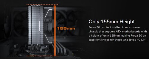 Forza 50 je skvělým chladičem pro procesory nížší a střední třídy díky unikátnímu přednímu krytu a silnému ventilátoru COUGAR MHP120. Design vakuového tunelu pomáhá jednosměrnému plynutí vzduchu, aby se co nejlépe přesouvalo teplo ze skříně pryč. Malé a relativně nízké provedení zaručuje vysokou kompatibilitu. Na druhou stranu mřížky je možné nainstalovat druhý 120mm ventilátor pro vyšší chladící výkon.