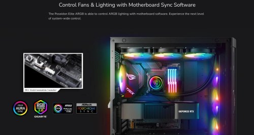 The Poseidon Elite ARGB is able to control ARGB lighting with motherboard software. Experience the next level of system-wide control.