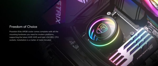 Poseidon Elite ARGB cooler comes complete with all the mounting hardware you need for modern platforms, supporting the latest AMD and Intel CPU sockets. Installation is a matter of mere minutes!