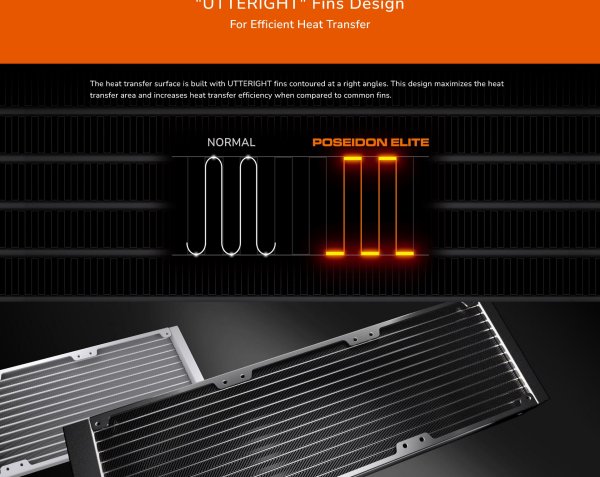 The Poseidon Elite ARGB AIO liquid cooler delivers high cooling performance. With unique 90-degree UTTERIGHT fins, high-efficiency fans, and brilliant ARGB lighting in an infinity mirror design, your system will run and look at its best.