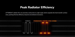 Žebra radiátoru UTTERIGHT jsou přesně tvarována v pravém úhlu, což zvětšuje plochu pro přenos tepla a zvyšuje tepelnou účinnost nad úroveň konvenčních konstrukcí.
