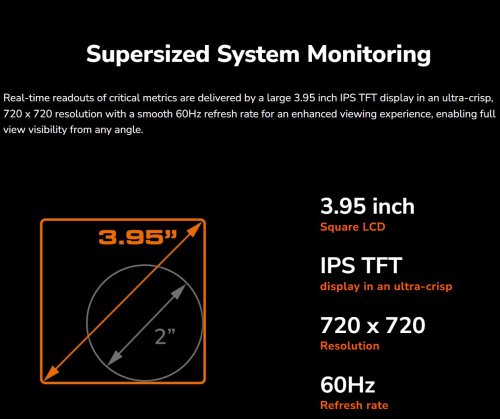 Kritické metriky jsou zobrazovány v reálném čase na velkém 3,95" IPS displeji s ultraostrým rozlišením 720 x 720 a plynulou obnovovací frekvencí 60 Hz, což zajišťuje lepší zážitek ze sledování a umožňuje plnou viditelnost z jakéhokoli úhlu.