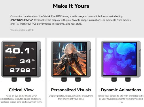 Přizpůsobte si vizuální prvky s Vistek Pro ARGB pomocí široké škály kompatibilních formátů, včetně JPG/PNG/GIF/MP4.*