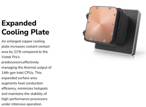 Zvětšená měděná chladicí deska zvyšuje kontaktní plochu chladicího média o 21 % ve srovnání s předchozími modely Vistek Pro, čímž účinně řídí tepelný výkon procesorů Intel 14. generace. Tato rozšířená plocha zvyšuje účinnost vedení tepla, minimalizuje horká místa a udržuje stabilitu vysoce výkonných procesorů při intenzivním provozu.