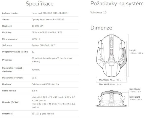 12 programovatelných tlačítek myši DUALBLADER je plně konfigurovatelných prostřednictvím systému COUGAR UIX, který hráčům umožňuje nastavit většinu ze tří profilů na desce, nastavit makra a zkratky a ještě více sekundárních funkcí pro dosažení maximálního herního výkonu. DUALBLADER je rozhodně nejlepší volbou pro jakoukoli hru!