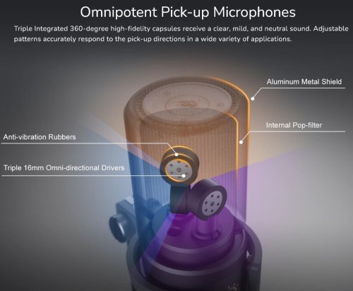 Triple Integrated 360-degree high-fidelity capsules receive a clear, mild, and neutral sound. Adjustable patterns accurately respond to the pick-up directions in a wide variety of applications.