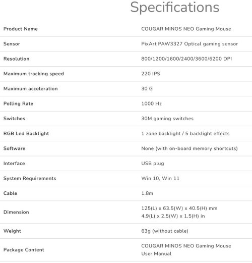 PC myš COUGAR MINOS NEO White Part Number CGR-WLMW-MINEO