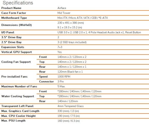 Airface má perforovaný přední panel pro zajištění silného proudění vzduchu. Jedná se o 230 mm širokou konstrukci mid-tower, která nabízí dostatek místa pro chladič CPU, kabeláž, kompatibilitu se základní deskou E-ATX a Hi-end grafické karty až do 330 mm. Ve srovnání s předchozími herními skříněmi je to upgrade ve všech aspektech.