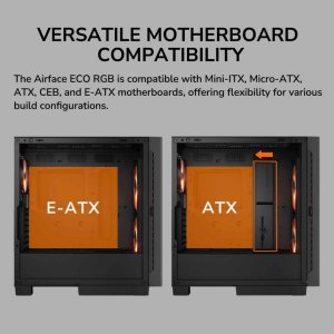 Airface ECO RGB je kompatibilní se základními deskami Mini-ITX, Micro-ATX, ATX, CEB a E-ATX a nabízí tak flexibilitu pro různé konfigurace sestav.
