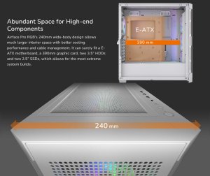 Širokoúhlá konstrukce 240mm skříně Airface Pro RGB umožňuje mnohem větší vnitřní prostor s lepším chladicím výkonem a správou kabelů. S jistotou se do něj vejde základní deska formátu E-ATX, 390mm grafická karta, dva 3,5" pevné disky a dva 2,5" SSD, což umožňuje sestavit i ty nejextrémnější systémy.