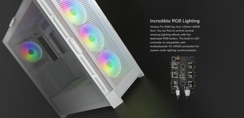 Airface Pro RGB má čtyři 120mm ventilátory ARGB. Pomocí tlačítka RGB můžete ovládat několik úžasných světelných efektů. Vestavěný LED ovladač je kompatibilní s 5V připojením ARGB základních desek pro synchronizaci osvětlení v rámci celého systému.