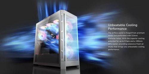 Panel pro proudění vzduchu je vyrobený z prvotřídního kovu a perforovaný otvory o průměru 5,0 mm. Díky vynikajícímu chladicímu potenciálu pro až 9 ventilátorů a 190mm chladič procesoru poskytuje rozsáhlý přívod čerstvého vzduchu, který vám přináší bezkonkurenční chladicí výkon.