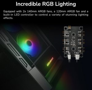 Duoface RGB má dva masivní 140mm ventilátory ARGB, 120mm ventilátor ARGB a zvýrazněné logo. Pomocí vyhrazeného tlačítka RGB můžete volně ovládat několik úžasných světelných efektů. Vestavěný LED ovladač je kompatibilní s 5V ARGB připojením základních desek pro synchronizaci osvětlení v rámci celého systému.