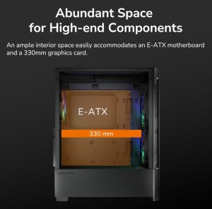 Širokoúhlá konstrukce 230mm skříně Duoface RGB umožňuje mnohem větší vnitřní prostor s lepším chladicím výkonem a správou kabelů. S jistotou se do něj vejde základní deska formátu E-ATX, 330mm grafická karta, dva 3,5" pevné disky a dva 2,5" disky SSD, což umožňuje sestavit i ty nejextrémnější systémy.