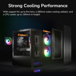 Podporuje až pět ventilátorů, 280mm vodní chladič a chladiče procesoru až do výšky 190 mm