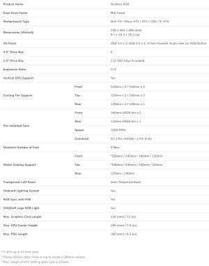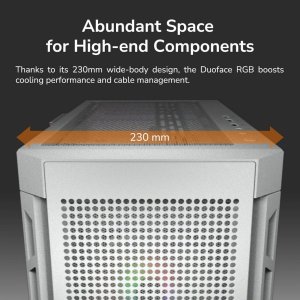 Širokoúhlá konstrukce 230mm skříně Duoface RGB umožňuje mnohem větší vnitřní prostor s lepším chladicím výkonem a správou kabelů. S jistotou se do něj vejde základní deska formátu E-ATX, 330mm grafická karta, dva 3,5" pevné disky a dva 2,5" disky SSD, což umožňuje sestavit i ty nejextrémnější systémy.