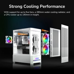 Podporuje až pět ventilátorů, 280mm vodní chladič a chladiče procesoru až do výšky 190 mm